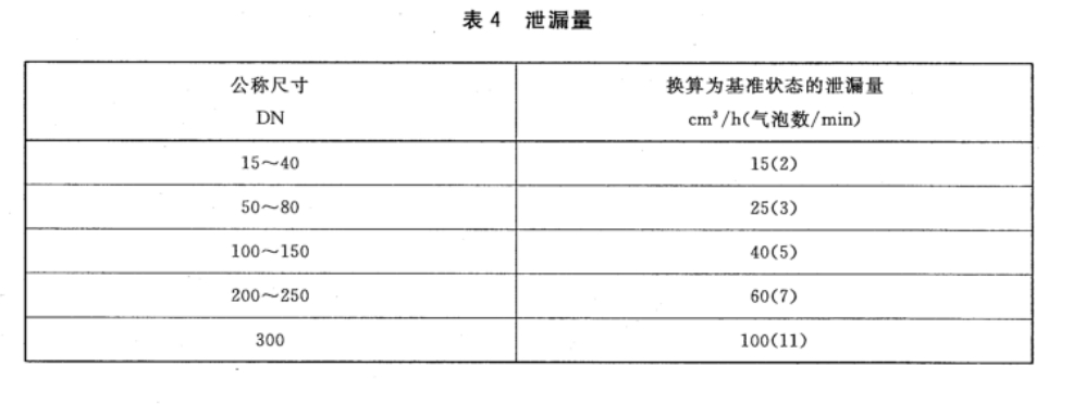 切斷閥處于關(guān)閉狀態(tài),人口側(cè)通入600 Pa的壓縮空氣,持續(xù)時(shí)間不小于1 min,泄漏量應(yīng)符合表4的規(guī)定。