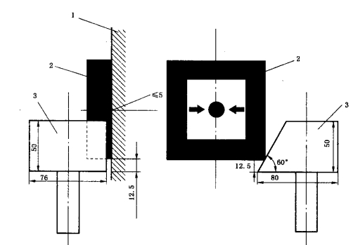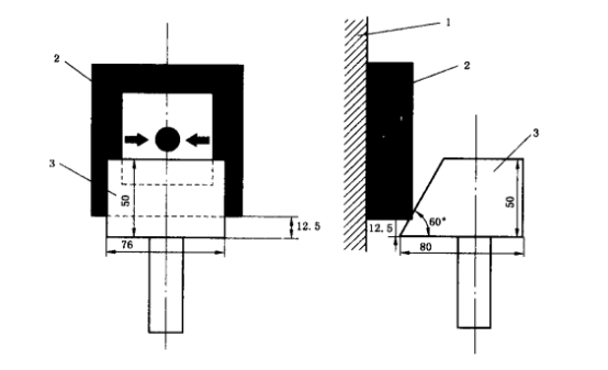 2.2調(diào)整碰撞試驗設(shè)備,使錘頭碰撞面能夠分別從圖1和圖2所示的兩個方向,以1.5m/s±0.13m/s的錘頭速度,1.9J±0.1J的碰撞動能碰試樣一次。碰撞后,保持2min,觀察并記錄試樣。狀態(tài)