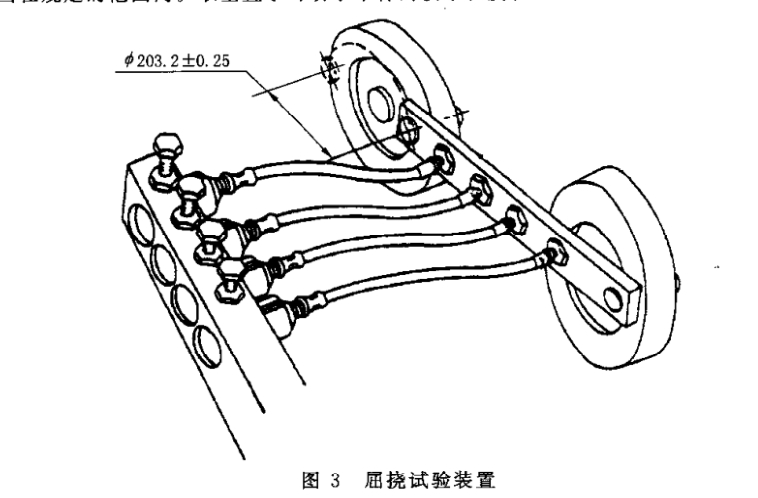 試驗(yàn)設(shè)備(見圖3)由轉(zhuǎn)動部分和固定部分組成。轉(zhuǎn)動部分為可動水平桿及通過軸承垂直安裝在可動水平桿兩端的轉(zhuǎn)盤,轉(zhuǎn)盤的中心與軸承的中心相距100 mm;固定部分為可調(diào)的非動水平桿,該水平桿平行于和轉(zhuǎn)盤中心在同一水平面內(nèi)的可動水平桿。兩個(gè)水平桿上都裝有可平行安裝軟管組合件的若干個(gè)接頭。轉(zhuǎn)盤以800 r/min+10r/min的速率旋轉(zhuǎn)。因此固定在可動水平桿上的軟管端部也以此速率轉(zhuǎn)動,形成直徑為203. 2 mm士0.25 mm的圓形軌跡,而軟管的另一端則固定不動。封住可動水平桿上的接頭,而非動水平桿上的接頭與和液壓源相接的歧管是連通的。應(yīng)采用一個(gè)控制開關(guān),以便因軟管損壞而液壓下降時(shí)使試驗(yàn)裝置停車。另外還應(yīng)配置一個(gè)記錄時(shí)間的指示器。