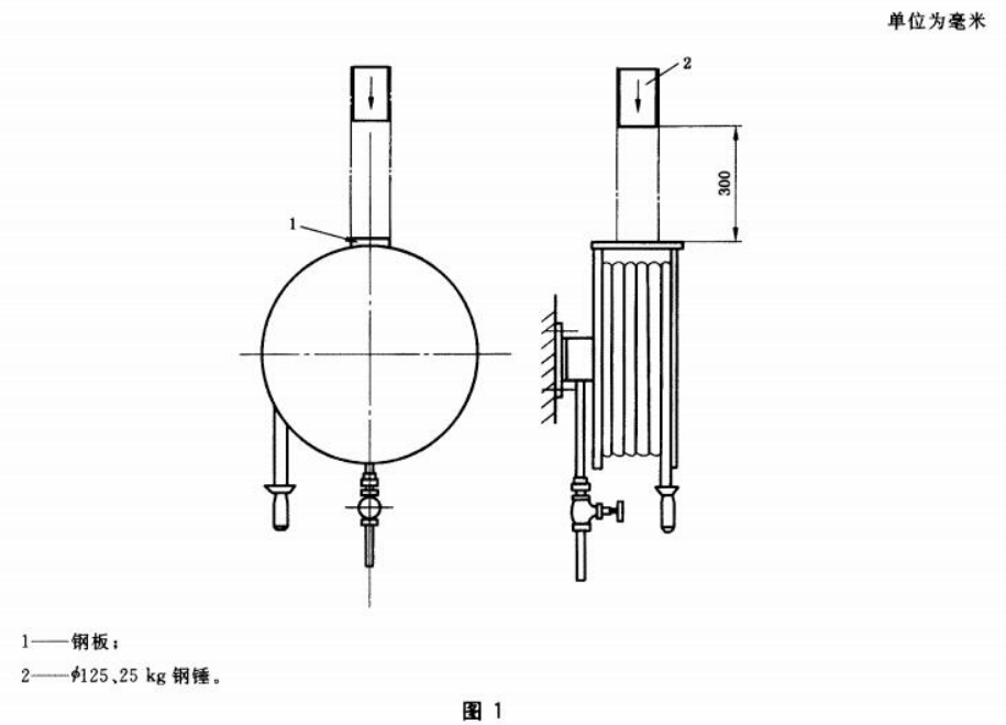 按制造廠規(guī)定的安裝方法,將試樣固定安裝在沖擊試驗架上,使試樣通路灌滿水,然后將截面為100 mm×25 mm,長度比卷盤兩側板間距略長的鋼板平放在兩側板上;將質量25 kg、直徑125 mm的鋼錘從距離鋼板上平面300 mm處自由落下沖擊鋼板1次,落點為兩側板中央位置。沖擊后再按6.2進行試驗,其結果應符合規(guī)定。